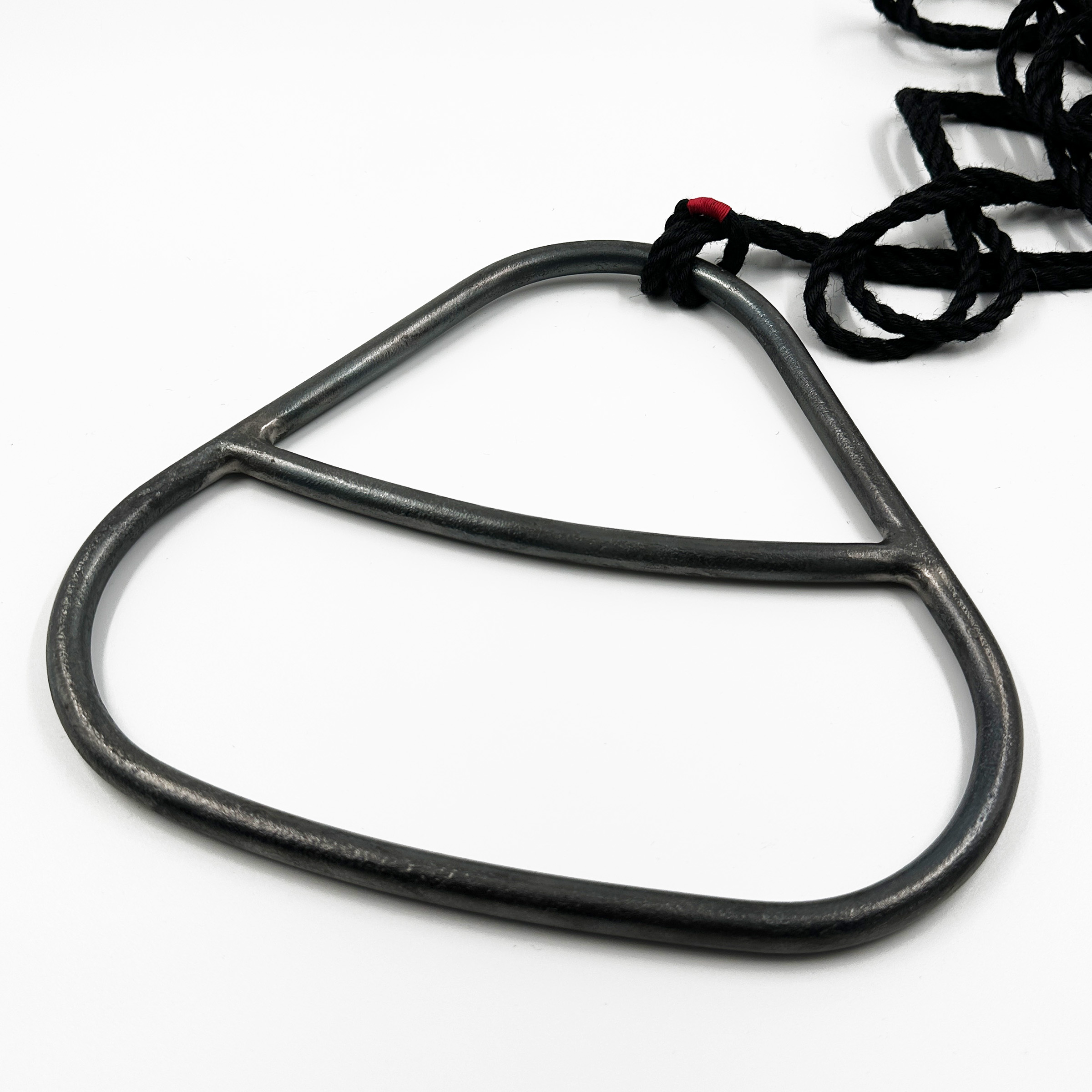 Der Triangel aus Stahl wird aus einem 12 Millimeter Rundstab von Eveline in der Schweiz geschmiedet. Er besteht aus einer dreieckigen Form mit abgerundeten Ecken und einer Unterteilung in der Höhe, was mehr Platz für Seil ergibt. Die Breite des Rings beträgt 270 und die Höhe 250 Millimeter. Er besitzt eine natürliche, schwarze Walzhaut, die den Stahl vor Korrosion schützt. Durch das mehrmalige Bürsten und wieder im Feuer erhitzen bekommt der Triangel seine dunkle und sehr feine Oberfläche. Um den Korrosionsschutz zu erneuern oder um den Ring zu reinigen kann er mit Lein- oder Olivenöl eingerieben werden. Nach einigen Tagen Trockenzeit wird der Ring für den nächsten Einsatz poliert.